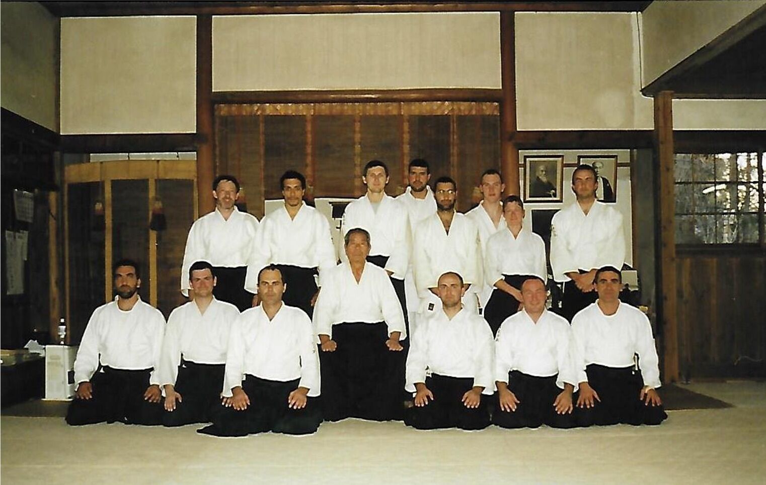 Mal vu … ! Alain qui n’en croit pas ses oreilles continue jusqu’à la porte du dojo, fait glisser le panneau coulissant, et s’agenouille pour se recueillir un instant. Le kamiza n’a pas changé. Sur les étagères polies par le temps, les coffrets en bois sculpté qui abritent quelques cheveux et quelques poils de la barbe d’O Sensei sont toujours là. A droite du kamiza les portrait d’O Sensei et de son fils Kisshomaru n’ont pas bougé. Sur le mur de droite, le vieux miroir qui a vu passer tant de pratiquants pendant tant d’années est là lui aussi, rassurant, surmonté de la calligraphie « Aiki Ueshiba » de la main d’O Sensei. Sur le mur de gauche, au-dessus du petit couloir vitré qui mène directement à la maison d’O Sensei, et qui était son accès personnel, ont été ajoutés quatre ou cinq posters un peu démesurés du Fondateur.