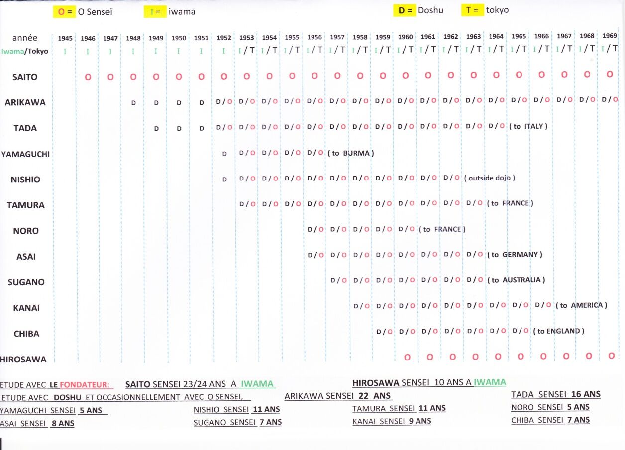 Pouvez-vous m’expliquer comment on devient un expert après parfois seulement 5 ans d’étude, tout en sachant que ces étudiants vivaient à Tokyo alors qu’O Sensei habitait Iwama depuis 1942 ? Je ne doute pas évidemment que tous ces jeunes citadins aient travaillé avec O Sensei, mais étant donné les circonstances ils n’ont pas pu le faire de manière régulière, ainsi que le montre le tableau.