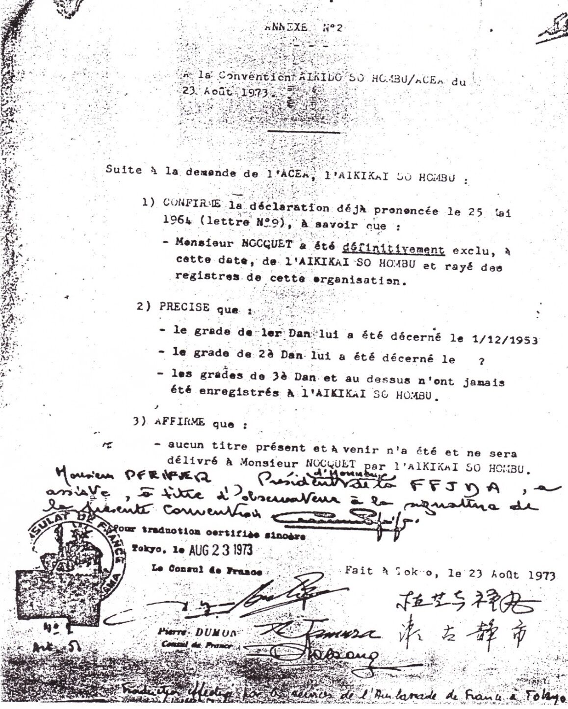 Je suis parti m’entraîner un mois au Japon, à l’Aikikai en août 1973. A Orly, j’ai rencontré pour la première fois Tamura sensei et Pierre Chassang qui étaient du même voyage. Ils avaient d’ailleurs au retour dans leur bagages le document suivant, qui mettait à mal les prétentions de monsieur Nocquet :
