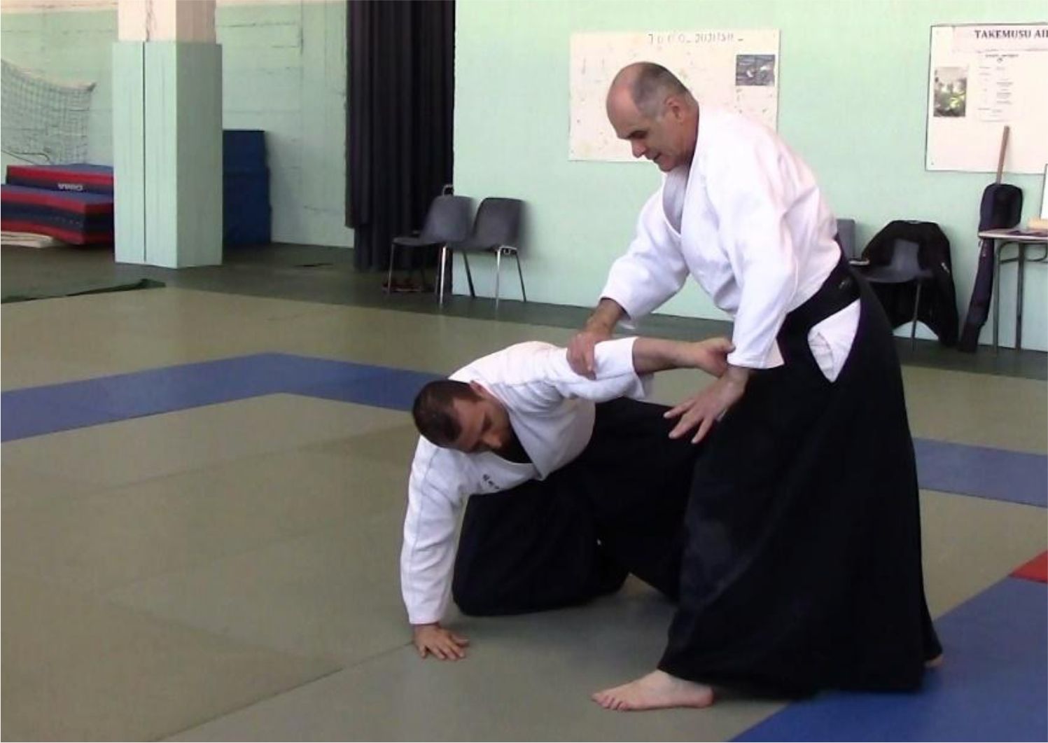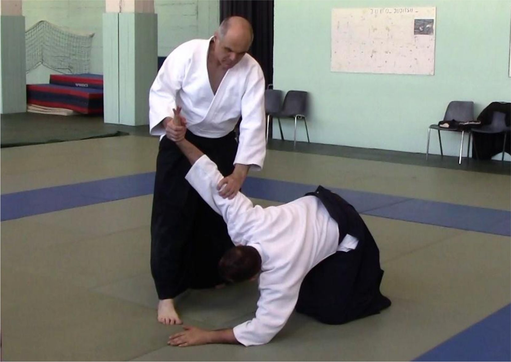 Dans le deuxième temps du mouvement, la rotation des hanches efface la jambe vers l’arrière en même temps que le bras supérieur de tori "coupe" du haut vers le bas. L’effacement de cette jambe arrière crée le vide dans lequel "tombe" uke, déséquilibré par sa propre saisie du bras qui coupe :